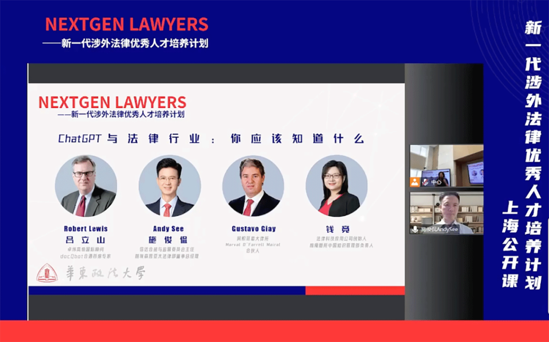 2023年4月22日下午,由华东政法大学主办的“NextGen Lawyers新一代涉外法律优秀人才培养计划”系列课程在上海顺利开展,信达资深顾问、合规与监管专业委员会主任施俊侃律师受邀通过线上方式参加。作为特邀专家讲师,施律师就ChatGPT对法律行业的影响进行了讨论,并为年轻律师提出了相关职业建议。
